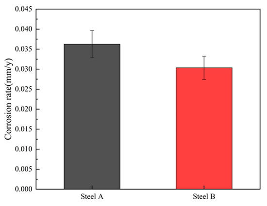 The calculated carbon-equivalent (CE(IIW)) values for Steel A and Steel B are 0.0394 and 0.454, respectively. Notably, while the CE(IIW) of Steel B exhibits a slight increase, it remains within a low threshold, ensuring that both experimental steels can be processed using the identical welding simulation parameters. Figure 1 presents the microstructure of Steel A and Steel B. The microstructure of the two steels is mainly a combination of granular bainite and polygonal ferrite, ensuring a good match of strength and toughness for X65 pipeline steel. Figure 2 presents the corrosion rates of the two steels in supercritical CO2 environments. The test steels were machined into corrosion coupons with dimensions of 50 mm × 10 mm× 2.7 mm. Triplicate specimens were prepared for each condition. The experiments were conducted in a 3 L autoclave under water-saturated supercritical CO2 conditions (containing 10 g H2O) at 10 MPa and 50 °C. After 168 h of exposure, the specimens were retrieved, dried, and pickled to obtain corrosion data. Steel B, with higher Cr content, exhibited an increased proportion of granular bainite and demonstrated enhanced corrosion resistance.