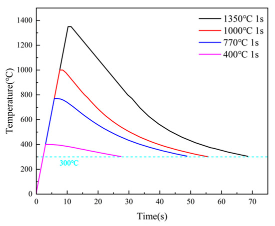 The phase transformation critical points Ac₁ and Ac₃ of the experimental steels were determined using the tangent method based on temperature dilation curves. The values for Steel A were 680 °C/890 °C, and for Steel B, 688 °C/910 °C. Specimens of 10.5 mm × 10.5 mm × 60 mm were cut along the rolling direction of the laboratory-rolled plates and subjected to thermal simulation experiments using a Gleeble 3800 thermal mechanical simulator, as shown in Figure 3a. The experiment utilized a welding heat input of 30 kJ/cm to simulate the single-pass welding process of X65 pipeline steel under actual production conditions. Based on the phase transformation critical points of the experimental steels, different peak temperature intervals were set: CGHAZ: 1350 °C; fine-grained heat-affected zone (FGHAZ): 1000 °C; intercritical heat-affected zone (ICHAZ): 770 °C; subcritical heat-affected zone (SCHAZ): 400 °C. The thermal simulation cycle curves for different peak temperatures are illustrated in Figure 4.