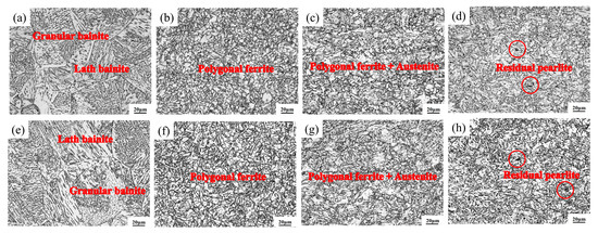 Metallographic structure of different HAZ subregions of experimental steel: (a) Steel A 1350 °C; (b) Steel A 1000 °C; (c) Steel A 770 °C; (d) Steel A 400 °C; (e) Steel B 1350 °C; (f) Steel B 1000 °C; (g) Steel B 770 °C; (h) Steel B 400 °C.