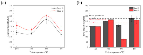 Influence of different peak temperature on mechanical properties of experimental steel (a) microhardness; (b) impact toughness.