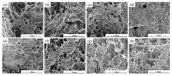 Impact fracture of experimental steel at different peak temperatures: (a) Steel A 1350 °C; (b) Steel A 1000 °C; (c) Steel A 770 °C; (d) Steel A 400 °C; (e) Steel B 1350 °C; (f) Steel B 1000 °C; (g) Steel B 770 °C; (h) Steel B 400 °C.