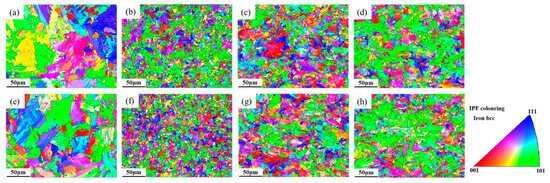 Inverse pole figures of test steel at different peak temperatures (a) Steel A 1350 °C; (b) Steel A 1000 °C; (c) Steel A 770 °C; (d) Steel A 400 °C; (e) Steel B 1350 °C; (f) Steel B 1000 °C; (g) Steel B 770 °C; (h) Steel B 400 °C.