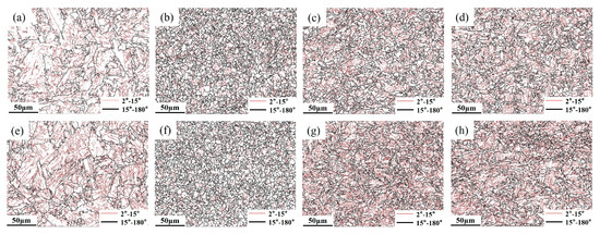Grain boundary diagrams of experimental steel at different peak temperatures: (a) Steel A 1350 °C; (b) Steel A 1000 °C; (c) Steel A 770 °C; (d) Steel A 400 °C; (e) Steel B 1350 °C; (f) Steel B 1000 °C; (g) Steel B 770 °C; (h) Steel B 400 °C.