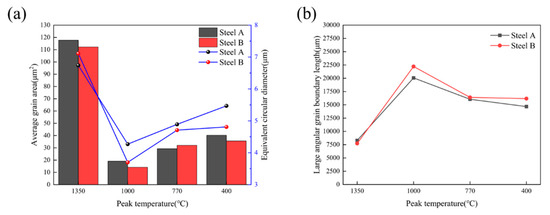 EBSD analysis of experimental steel at different peak temperatures: (a) grain size; (b) large angular grain boundary length.