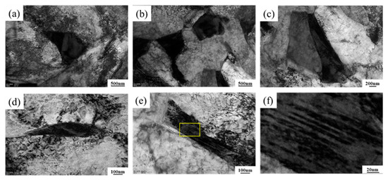 Microstructure of M-A components of Steel B in ICHAZ (770 °C): (a) TEM image of the sharp M-A components; (b) TEM images of block M-A components; (c) TEM images of rod M-A components; (d) TEM images of chain M-A components at grain boundaries; (e) TEM images of the long M-A block; (f) enlarged view of the yellow box in (e).