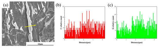Figure 14 presents the scanning electron microscopy (SEM) image and corresponding energy-dispersive X-ray spectroscopy (EDS) analysis of chain-like M-A constituent formed along grain boundaries in Steel B after a thermal cycle with a peak temperature of 770 °C. A line-scan analysis was conducted to investigate the elemental distribution across the chain-like M-A constituent, with the scanning path (4.3 μm in length) illustrated in Figure 14a. Figure 14b,c reveal pronounced elemental enrichment, particularly in carbon (C) and silicon (Si), within the grain boundary-located M-A constituent. Notably, the C concentration exhibits a distinct peak signal at the M-A constituent regions, indicating significantly higher C content compared to the matrix. The formation of chain-like M-A constituent at grain boundaries is closely associated with localized C accumulation. As a strong carbide-forming element, Cr binds with carbon to form stable carbides (e.g., Cr23C6), reducing the free carbon concentration and diffusivity in austenite, thereby promoting heterogeneous austenitization in the ICHAZ [43]. During this process, undissolved carbides pinned the grain boundaries, creating carbon concentration gradients that led to localized C-rich microregions. Upon rapid cooling, these microregions preferentially transformed into core–shell M-A constituent, where the core consists of retained austenite with micro-twins, and the shell comprises high-hardness lath martensite. The synergistic effect of micro-twins and interfacial thermal mismatch stress induced localized stress concentration, triggering microcrack nucleation and subsequent toughness degradation. Furthermore, the prior austenite grain boundary regions inherently contain abundant vacancies and defects, which accelerate C diffusion and elevate C concentration near boundaries, thereby facilitating preferential precipitation of M-A constituent. Intriguingly, Si also shows moderate enrichment within the M-A constituent. These findings demonstrate that the formation mechanism of chain-like M-A constituent is governed by chemical heterogeneity and atomic diffusion kinetics, with such microstructural characteristics exerting profound impacts on material performance [14].