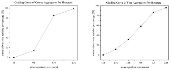 In the present investigation, the composition of shotcrete comprises ordinary Portland cement (Type PO. 42.5, ESheng Cement Ltd., Emeishan City, China), class II fly ash, fine aggregate, coarse aggregate, accelerator, and superplasticizer. Notably, the fine aggregate employed is sourced from natural river sand, exhibiting a fineness modulus of 2.9, while the coarse aggregate is derived from crushed limestone, featuring a maximum aggregate size of 10 mm. Figure 1 illustrates the particle size distribution of coarse and fine aggregates [17]. The precise proportions of the constituent materials, namely cement, fly ash, fine aggregate, coarse aggregate, accelerator, superplasticizer, and water, are meticulously outlined in Table 1. It is imperative to underscore that the introduction of superplasticizer serves the primary purpose of augmenting the flowability of shotcrete, thereby facilitating its conveyance through pipelines. Conversely, the accelerator is strategically incorporated to mitigate the setting time, ensuring that the shotcrete acquires the requisite strength within a condensed temporal frame. In accordance with the provisions of Chinese standards [18,19], the performance parameters of the superplasticizer and accelerator are determined through experiments. Detailed specifications pertaining to the superplasticizer and accelerator can be found in Table 2 and Table 3, respectively.