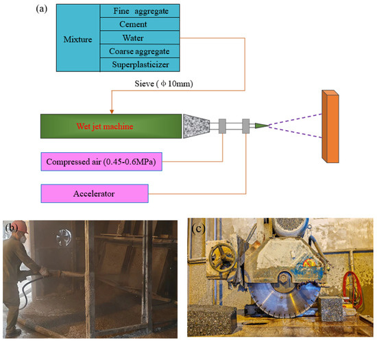 Manufacturing process of shotcrete: (a) process diagram; (b) spraying scenario; (c) specimen cutting.