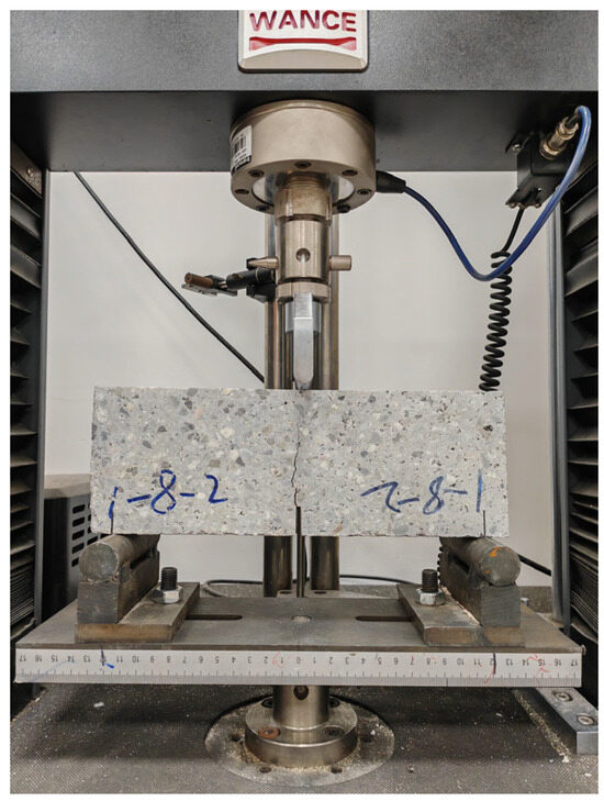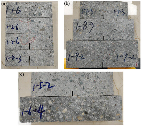 After curing, three large slabs are cut into several small samples with different widths, geometries, and initial notch lengths, as depicted in Figure 3. Notably, the thickness of all specimens is standardized at 50 mm. Then, as shown in Figure 4, the three-point bending test (3-p-b) is systematically conducted on these samples at a controlled loading rate of 0.1 mm/min, with the corresponding load–displacement curves meticulously recorded for further analysis [21,22]. As shown in Table 4, the geometric dimensions and average failure loads of specimens in nine groups are summarized.
