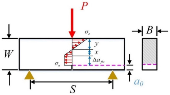 The three-point bending test is a widely employed method for assessing the fracture toughness of quasi-brittle materials. As depicted in Figure 5, it is postulated that the stress distribution along the unnotched ligament can be delineated as consisting of linear compressive and linear tensile regions, alongside a constant tensile area, as supported by prior studies [32,33,34]. Subsequently, the relation between maximum failure loads Pmax and nominal stress is established, as outlined in Equation (7).