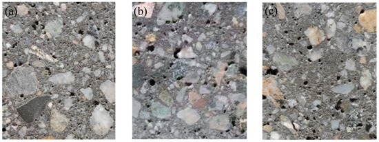 Considering the significant impact of micro-structure on the determination of fracture toughness, an initial analysis of the micro-structures of three batches of shotcrete is conducted. As illustrated in Figure 6, 2D images of the shotcrete are collected, revealing the presence of numerous voids within the specimens. This occurrence is primarily attributed to the utilization of compressed air and accelerator during the production process. Consequently, the integration of image processing technology and deep learning algorithms is leveraged to characterize the distribution and volume of these voids, as documented in prior studies [35,36]. To determine the porosity, four representative two-dimensional cross-sectional images were selected for each batch. These images were processed using a Python (3.8)-based image analysis script, in which pores were automatically identified through grayscale thresholding. The porosity index (p) was then calculated accordingly. The resulting porosity values for the three batches of shotcrete were determined to be 0.151, 0.208, and 0.197, respectively. Furthermore, the average aggregate size (Gav) is conservatively set at half the value of the maximum aggregate size, which is 5 mm.