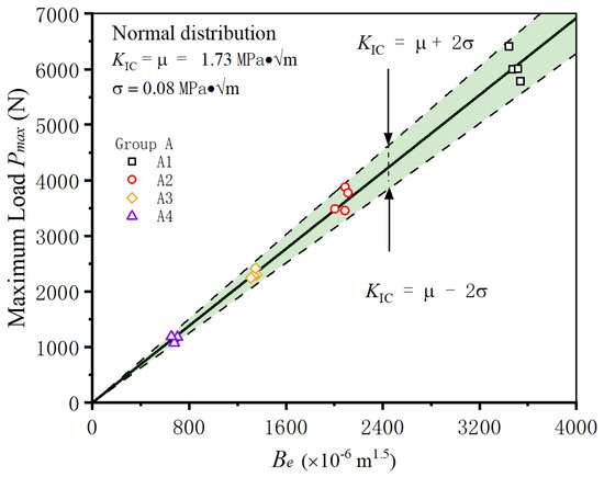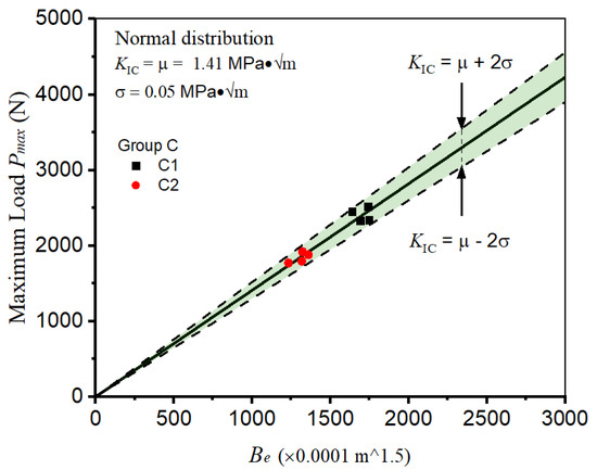 Based on Equations (1), (4), (7), and (8), the relation between fracture toughness and maximum failure loads is effectively modeled and articulated as depicted in Equation (9).