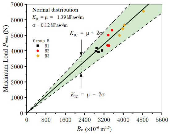 The specimens with different sizes but single α-ratio are always adopted to study the size effect phenomenon of concrete fracture toughness. In group B, the specimens share identical geometrical configurations, featuring an equivalent span-to-width ratio (2.5) and α-ratio (0.2). The widths of three batches of specimens are cut into 80 mm, 100 mm, and 120 mm, respectively. Here, the middle-sized specimens in group B2 are adopted to predict the fracture of samples in the other two groups. Firstly, the distribution of fracture toughness in group B2 is analyzed. Then, the triangle predictive area is constructed with Equation (9) and distribution characteristics, as shown in Figure 8. After that, the fracture test results of groups B1 and B3 are placed in the same coordinates. It could be found that most data in group B1 and B3 fall within the predictive area. This observation strongly indicates the robust predictive capability of the model in anticipating the fracture behavior of specimens within groups B1 and B3, which indicates that the fracture of specimens in groups B1 and B3 are well predicted. With the help of the established model, it is reasonable to ignore the impact of specimen size on the determination of shotcrete fracture toughness, effectively bypassing the size effect phenomenon.