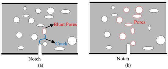 The uniformity in mixture design across the three batches of specimens primarily highlights disparities attributed to variations in the air compression pressure during the manufacturing process, consequently leading to discrepancies in pore quantities and sizes. From the aforementioned discussion, it can be observed that the calculated fracture toughness is independent of specimen dimensions, initial crack length, and geometric shape, which means that it can be considered as a material constant. The computed fracture toughness values for groups A, B, and C are 1.73 MPa·√m, 1.37 MPa·√m, and 1.41 MPa·√m, respectively. Evidently, a discernible inverse relationship is discernible, indicating that the fracture toughness of shotcrete diminishes with an increase in porosity. In fact, the influence of pores on the fracture toughness of concrete can be discerned through two distinct facets, as elucidated in Figure 10 [38,39]. On one hand, the presence of pores can effectively blunt the crack tip, thereby postponing crack propagation, reinforcing the material and augmenting its fracture toughness. On the other hand, an escalation in the volume fraction of pores precipitates the weakening of the load-bearing ligament. For the shotcrete materials, the deleterious impact of pores outweighs their reinforcing effects. Consequently, it is imperative to exercise stringent control over the pore content during the shotcrete production process, ensuring that it remains within an optimal and manageable range. Failure to adhere to these guidelines could potentially compromise the fracture toughness of the resulting material.