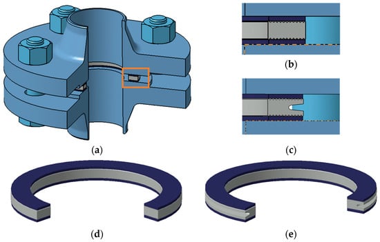 Components of the bolted flange joint: (a) view of the joint; (b) gasket section with symmetric core; (c) gasket section with asymmetric core; (d) view of the gasket with symmetric core; (e) view of the gasket with asymmetric core.
