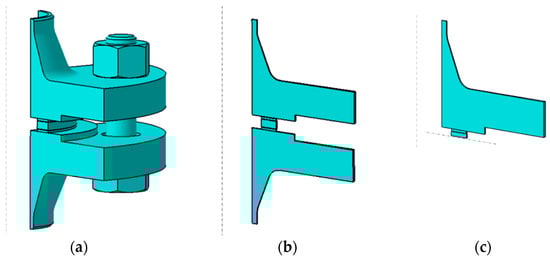 Model of the joint: (a) geometry simplified to 1/4 of the actual model; (b) geometry simplified to 1/360 of the actual model; (c) geometry simplified to 1/360 of the actual model and using symmetry in the gasket centre plane.