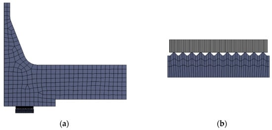 Discrete model of the joint: (a) view of the full finite element mesh; (b) finite element mesh in the vicinity of the gasket core and sealing layer.