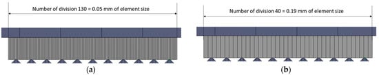 Mesh-independent test of the graphite layer: (a) mesh view with an element size of 0.05 mm; (b) mesh view with an element size of 0.19 mm.
