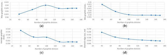 Results of the mesh-independent test of the graphite layer: (a) maximum graphite strain; (b) minimum graphite strain; (c) average graphite strain; (d) element edge size.