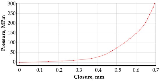 An elastic model was used to represent the mechanical properties of the flange and the gasket core, assuming a value of Young’s modulus and Poisson’s ratio. The material properties of the metal part of the joint were collected in Table 1. To represent the properties of the graphite caps, a non-linear gasket-type model available in the material database of the calculation programme used was applied. The compression characteristics of the graphite introduced in this material model were obtained from tests (based on EN 13555 [51,52]). The course of this characteristic is shown in Figure 6.
