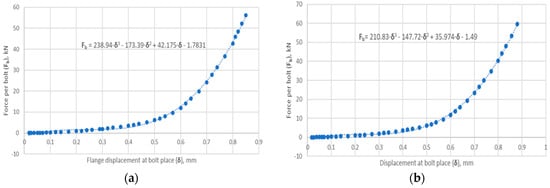 The relationship between the bolt force (as one-quarter of the reaction force) and flange displacement for (a) joint with symmetric gasket and (b) joint with asymmetric gasket.