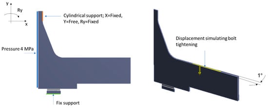 A pressure of 4 MPa was applied to the inner walls of the model from the pressure of the medium to be sealed. The maximum displacement value was 0.8 mm. The target tension for a single bolt was 25 kN. The boundary conditions are presented in Figure 8. The contact between the graphite surface and the metal surfaces of the flange and the sealing core was defined as frictional, with the graphite surface set as ‘Contact’ and the metal surfaces as ‘Target’. The discretisation parameters of the contact surfaces are presented in Table 2.