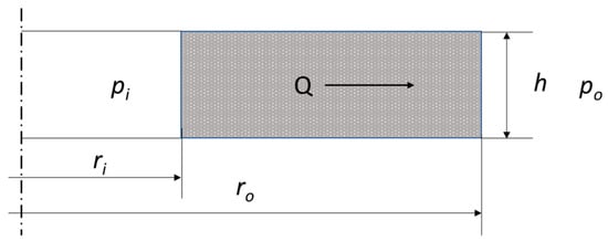 The objective of the analytical calculations was to estimate the leakage through the graphite caps of the analysed sealing solutions in two variants of the shape of the metal core. A model of fluid flow through a cylindrical porous bed, shown in Figure 9, was adopted as the analytical model.