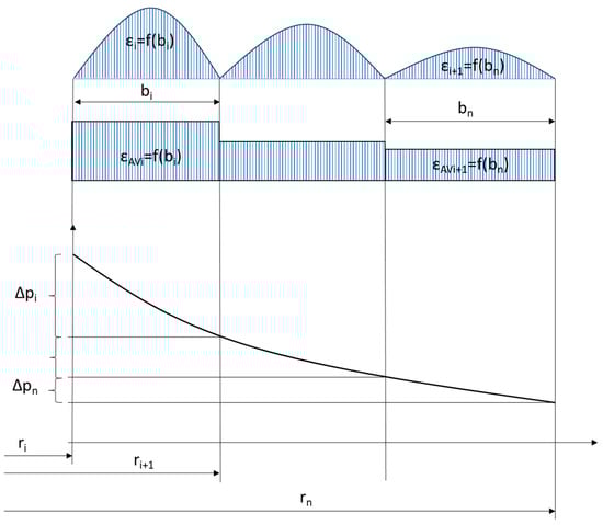 Equation (1) allows the flow through a porous gasket layer to be modelled when the contact pressure on the gasket surface is uniform. Otherwise, the thickness of the layer (cap) and its permeability depends on its degree of deformation (compression). When the contact pressure on the sealing surface is uneven, it seems appropriate to isolate the zones (sealing widths) in which there is quasi-uniform pressure, calculate the permeability and layer thickness in these zones, and then add up the resulting partial values. In the case of the structure shown in Figure 1, the pressure concentration zones of the graphite layer are caused by the individual ridges cut into the metal core of the gasket. By transforming Equation (1), it is possible to count the pressure drop that will occur as a result of fluid flow through a single zone of pressure concentration of the graphite layer, caused by a given ridge of the gasket with known inner and outer radii, ri and ri+1: