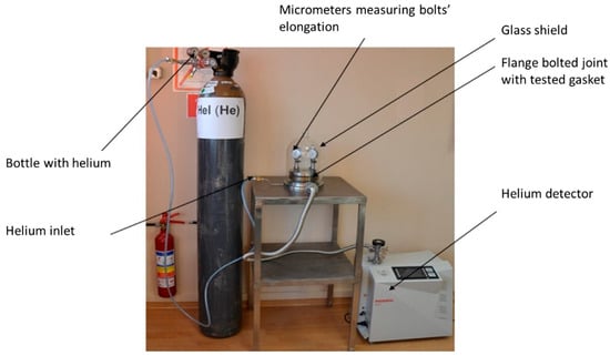 Figure 11 shows the test rig. It consists of two blinded flanges with dimensions corresponding to the DN40 PN40 designation, four M16 bolt connections, micrometres (to measure bolt deformation during tensioning), a helium detector, and a bottle of helium.
