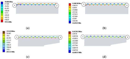 Results of numerical calculations: (a) contact pressure between the graphite layer and the ridges of the symmetric gasket core (MPa); (b) strain of graphite layer for the symmetric gasket core (mm); (c) contact pressure between the graphite layer and the ridges of the asymmetric gasket core (MPa); (d) strain of graphite layer for the asymmetric gasket core (mm).