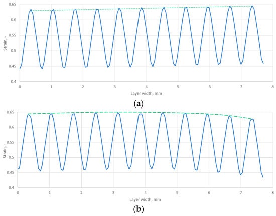 Strain distribution of the graphite layer along the width of the gasket for (a) symmetric core and (b) asymmetric core.
