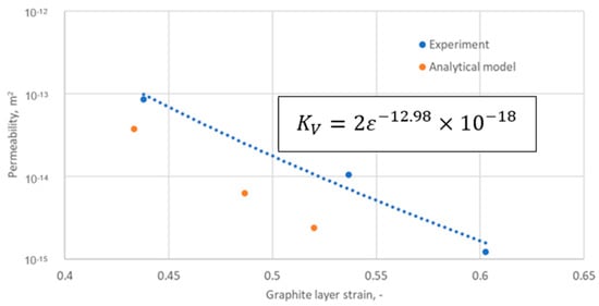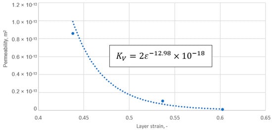 In Figure 21, the permeability values calculated using Equation (14) (based on data from Table 3) are compared with the experimentally determined permeability values. The values calculated by the model, compared to the measured ones, can be considered satisfactory. It can be seen that, in the strain range from 0.43 to 0.52, the permeability calculated through the model varies from 3.8 × 10−14 to 2.4 × 10−15, while the experimentally determined permeability in the comparable strain range, i.e., from 0.44 to 0.53, varies from 8.6 × 10−14 to 1.2 × 10−15.