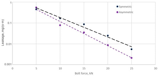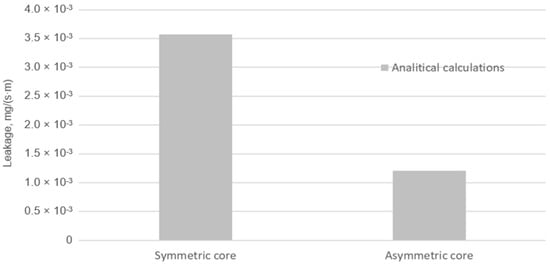 Based on Equations (6) and (7), the fluid leakage through the graphite sealing layer was calculated at the maximum applied tension of a single bolt of 25 kN. The calculated leakage values are shown in Figure 15. For the gasket with the symmetrical core, the leakage is almost three times higher. The analytically calculated leakage was 3.57 × 10−3 mg/(s·m) and 1.21 × 10−3 mg/(s·m) for the symmetrical and asymmetrical core cases, respectively.