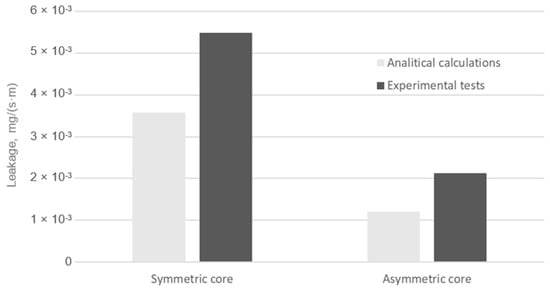 The percentage error between the mean value of the leakage measured experimentally and that obtained from analytical calculations is 34% and 43% for the symmetric core gasket and the asymmetric core gasket, respectively. The error between the measured and analytically calculated leakage is relatively large. This is a direct result of the measurement uncertainty of the detector used on the test stand, which can be as high as 30%. These differences may indicate a further need to expand the analytical model. On the other hand, both analytical calculations and measurements showed a higher sealing capacity for a gasket with an asymmetric core compared to a gasket with a symmetric core.