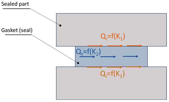 In general, the sealing mechanism at the interface of two surfaces separated by a sealing material should be considered in terms of two leakage components: the leakage component at the interface of the connected surfaces and the leakage component through the sealing material itself. In this case, the leakage model can be seen as a combination of two porous layers (in the form of rings) with different permeabilities and thicknesses. Consequently, the total leakage can be described by the following general form: