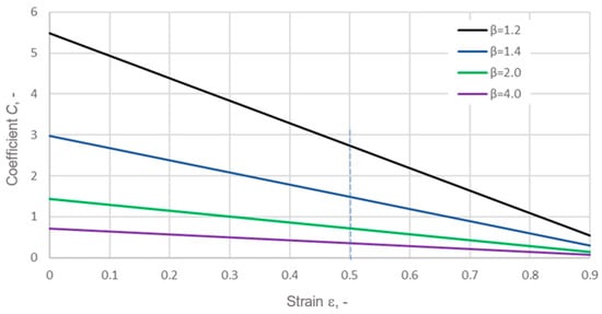It can be seen that, for a relatively small gasket width (i.e., for β = 2), a reduction in the gasket width leads to a multiple increase in the coefficient, C, which directly translates into an increase in leakage. Therefore, the design of a gasket with an asymmetric core allows the strain of the graphite layer to be increased without reducing the gasket width. Increasing the strain of the porous graphite layer results in greater compaction of the layer, which, in turn, reduces its permeability and leads to a higher degree of filling of the roughness profile of the surfaces to be sealed, quite like in the case of bonded surfaces [60,61].