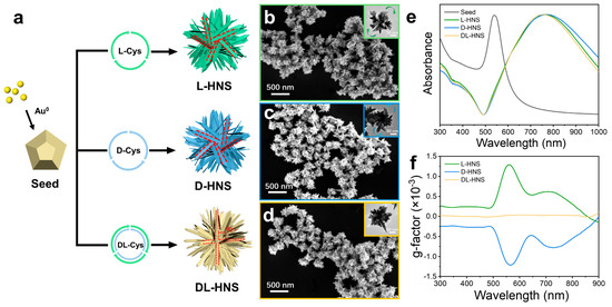 Growth of gold horns on the surface of gold polyhedrons and their morphological characteristics. (a) Schematic representation for growing gold horns on polyhedron in the presence of L-cysteine (L-Cys), D-cysteine (D-Cys), and DL-cysteine (DL-Cys), which produce chiral and achiral horned gold nanostructures (HNS). (b–d) SEM images of L-HNS, D-HNS, and DL-HNS, which are synthesized using 4 mM L-Cys (b), 4 mM D-Cys (c), and 4 mM D-Cys (d), respectively. Inserts: the corresponding TEM images of different HNSs. (e) Normalized UV–Vis absorption spectra of gold polyhedron seeds, chiral and achiral HNSs. (f) g-factor spectra of L-HNS, D-HNS, and DL-HNS, indicating that L-HNS and D-HNS exhibit larger and opposite chirality while DL-HNS have no chirality. The g-factors of L-HNS at 560 nm (mean = 0.0013, SD = 0.00000387, n = 5). The g-factors of D-HNS at 560 nm (mean = −0.0013, SD = 0.00000312, n = 5).