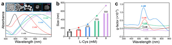 Effect of L-Cys concentrations on size and chirality of as-synthesized HNSs. (a) Normalized UV–Vis absorption spectra of HNSs synthesized using 0, 2, 4, 6, and 8 mM L-Cys. Insets: SEM images of the as-obtained HNSs using different concentrations of L-Cys from 0 to 8 mM (scale bar: 200 nm). (b) Evolution of the average size of HNSs measured by a nanoparticle size analyzer with an increment of L-Cys concentrations. (c) g-factor spectra of HNSs synthesized in the presence of different concentrations of L-Cys. It can be seen that the gradual increment of L-Cys continuously increases the size of HNSs. Still, their chirality exhibits an initial increment and subsequent decreasing trend (i.e., 4 mM L-Cys induces the largest chirality in HNSs).