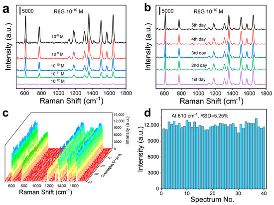 For the stability test of L-HNS substrate, the L-HNS substrate stored at room temperature for 0–6 days showed a change of less than 5% in SERS signal intensity for R6G at 10−10 M (Figure 3b). In addition, reproducibility assessment across 40 random measurement points (Figure 3c) confirmed substrate uniformity, with a relative standard deviation (RSD) of 5.25% for the 610 cm−1 peak intensity (Figure 3d).