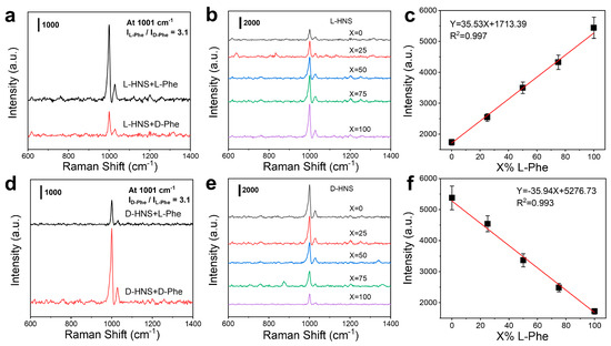 It is worth noting that the L-HNS synthesized with 4 mM L-Cys exhibited the best chiral recognition ability, with the SERS intensity of L-Phe being 3.1 times higher than that of D-Phe (Figure 4a). In contrast, D-HNS demonstrated that D-Phe adsorption resulted in a 3.1-fold stronger Raman signal compared to L-Phe (Figure 4d), a difference that was statistically significant (Figure S13, *** p < 0.001), which confirms the reliability of the data. This experimental result suggests that the chiral atomic arrangement within inorganic crystals (L-/D-HNS) may induce asymmetric adsorption of chiral molecules, and the chirality of substrates and analytes could lead to inhomogeneous adsorption patterns or orientation-dependent electromagnetic field enhancement, thus generating differences in Raman signal intensities [34,35]. Moreover, this chiral recognition capability directly correlates with measured g-factor magnitudes, where the enhanced chiral response determines excellent enantioselectivity. To quantify recognition performance, we analyzed mixed solutions of L-Phe and D-Phe (total concentration: 0.5 mM) with varying L-Phe volume fractions X% (X = 0, 25, 50, 75, and 100). Following 2 h adsorption on L-HNS and D-HNS substrates, the SERS intensity of the L-HNS substrate at 1001 cm−1 increased with an increase in X%, while the opposite was true on D-HNS (Figure 4b,e). In addition, the linear fitting relationship between I1001 (signal intensity at 1001 cm−1) and X was plotted separately (Figure 4c,f). This confirms that chiral HNSs exhibit excellent enantioselectivity and quantitative discrimination ability for pure chiral amino acids.