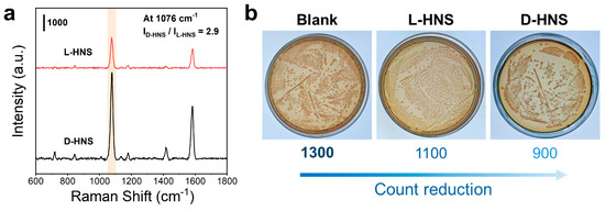 Adsorption affinity of chiral HNSs to bacteria E. coli and their biotoxicity. (a) SERS spectra of E. coli on L-HNS and D-HNS, in which the incubation time is 2 h, and a Raman probe 4-MPBA is used. (b) The average colony count of E. coli was measured in three experimental groups (n = 5): E. coli incubated with L-HNS, E. coli incubated with D-HNS, and a blank group without chiral HNSs. As seen, D-HNS has a much higher affinity to E. coli. than L-HNS, and they have a slight bactericidal ability via interaction.