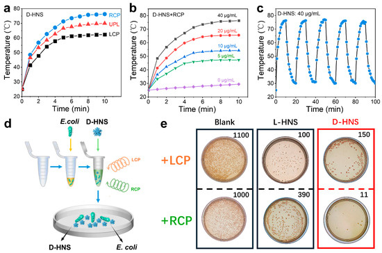 Significant polarization-dependent photothermal responses were observed between D- and L-HNS under CPL irradiation. Under RCP irradiation, D-HNS solutions exhibited markedly accelerated heating rates compared to UPL and LCP, with LCP showing the slowest temperature rise (Figure 6a). Conversely, L-HNS displayed an inverse polarization-dependent response, achieving optimal photothermal efficiency under LCP (Figure S18a). DL-HNS showed identical thermal responses under both CPL and UPL conditions (Figure S18b), demonstrating polarization-independent behavior due to its achiral structural symmetry. Given the biocompatibility of RCP and D-HNS’s enhanced binding affinity for E. coli, these components were prioritized for our photothermal conversion tests. As shown in Figure 6b, the photothermal equilibrium temperature continuously increases with the concentration of D-HNS from 0 to 40 μg/mL. Moreover, we conducted five on/off cycles of RCP irradiation on the D-HNS solution to determine its excellent photothermal repeatability and stability (Figure 6c).