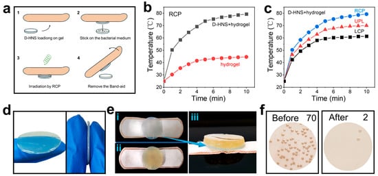 Hydrogel is a biomaterial capable of cell culture, tissue engineering, and drug delivery [44]. To expand the application scope of chiral HNSs materials, this study successfully developed an agarose-based composite hydrogel carrier incorporating chiral HNSs, constructing a directionally responsive antibacterial film through precise manipulation of photothermal conversion characteristics. As illustrated in Figure 7a, the experimental procedure comprised fabricating a D-HNS-doped hydrogel film, integrating it into a medical-grade bandage, and placing the solid E. coli culture medium on the hydrogel film. After 1 h of irradiation with RCP, the hydrogel sample was carefully removed and the number of colonies on the solid medium was recorded.