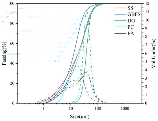 The particle size distribution of SS, GBFS, DG, PC, and FA.