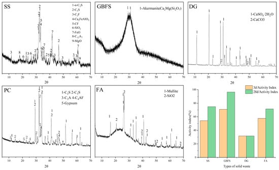 Raw materials, including SS, GBFS, DG, PC, and FA, are commercially available products in the market. Table 1 displays the chemical compositions of the raw materials. The particle size analysis of the solid waste materials used is shown in Figure 1. The major mineral compositions and material activity of SS, GBFS, DG, PC, and FA are shown in Figure 2, the main mineral composition of GBFS was the amorphous phase, since GBFS accounted for the highest proportion of the components, this resulted in the preparation of SWBC with an amorphous phase as the main mineral component. All raw materials were screened through a 75-micron sieve. Nano-SiO2 in Table 2 characterized by particle dimensions ranging from 7 to 40 nm and a definite surface area of 150 m2/g, was procured from Shanghai Aladdin Biochemical Technology Co., Ltd. (Shanghai, China).