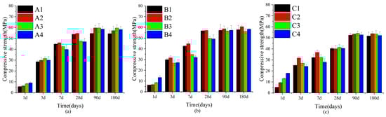 Variations in the compressive strength of SWBC due to varying nano-SiO2 contents over time: (a) Set A; (b) Set B; (c) Set C.