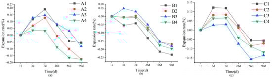 Nano-SiO2 demonstrated a notable modifying effect on cementitious materials. In Figure 4, nano-SiO2 in Groups A, B, and C effectively reduced the linear change rate of the cementitious material, thereby reducing its linear shrinkage. The incorporation of 0.5% and 2% nano-SiO2 significantly influenced SWBC. The addition of 0.5% nano-SiO2 enhances the formation of C-S-H gel and postpones the development and conversion of AFt, thereby minimizing its effect on SWBC [48]. Nano-SiO2 has high hydrophilicity. When the content of nano-SiO2 was too high, the internal moisture was adsorbed by nano-SiO2, which slowed down the hydration process of SWBC [41]. However, it did not affect its ultimate strength. This is also why 2% nano-SiO2 could effectively reduce the linear change in SWBC.