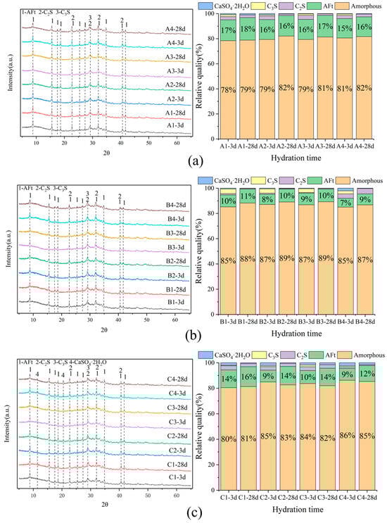 The XRD quantitative analysis mainly identified the formation of CaSO4·2H2O, C2S, AFt, and amorphous phases. It can be seen from the XRD quantitative chart that the amorphous gel accounted for the majority of the hydration products of SWBC. This is mainly because the amorphous content in GBFS powder was extremely high, accounting for more than 95%, and the amorphous content in SS and FA was relatively high, accounting for about 40% [36]. In Figure 5, Group A had a higher proportion of AFt, while Groups B and C had similar AFt content. This is mainly because the formation of AFt is influenced by DG and PC. The Ca2+ and SO42− ions produced by the dissolution of DG can react with C3A or Ca(OH)2 to form ettringite [51].