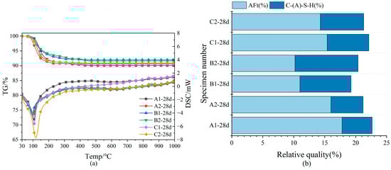 TG-DSC analysis of nano-SiO2 mixed with SWBC and relative mass percentage of hydration products: (a) TG-DSC graph; (b) Proportion of hydration products.