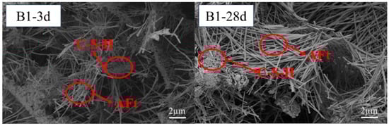 The hydration samples contained numerous needle-like structures, identified as AFt, a primary hydration product of SWBC. It was formed by the combination of DG and Ca(OH)2 from other hydration products. AFt formation significantly bolstered the early strength of the samples during hydration [58].